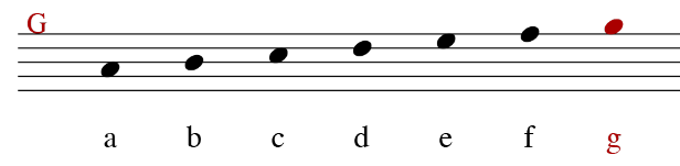 Um Tonhöhen auch mündlich zu benennen (ohne zu singen), gibst du jedem Ton einen Namen. Dazu nimmst du die ersten sieben Buchstaben des Alphabets: